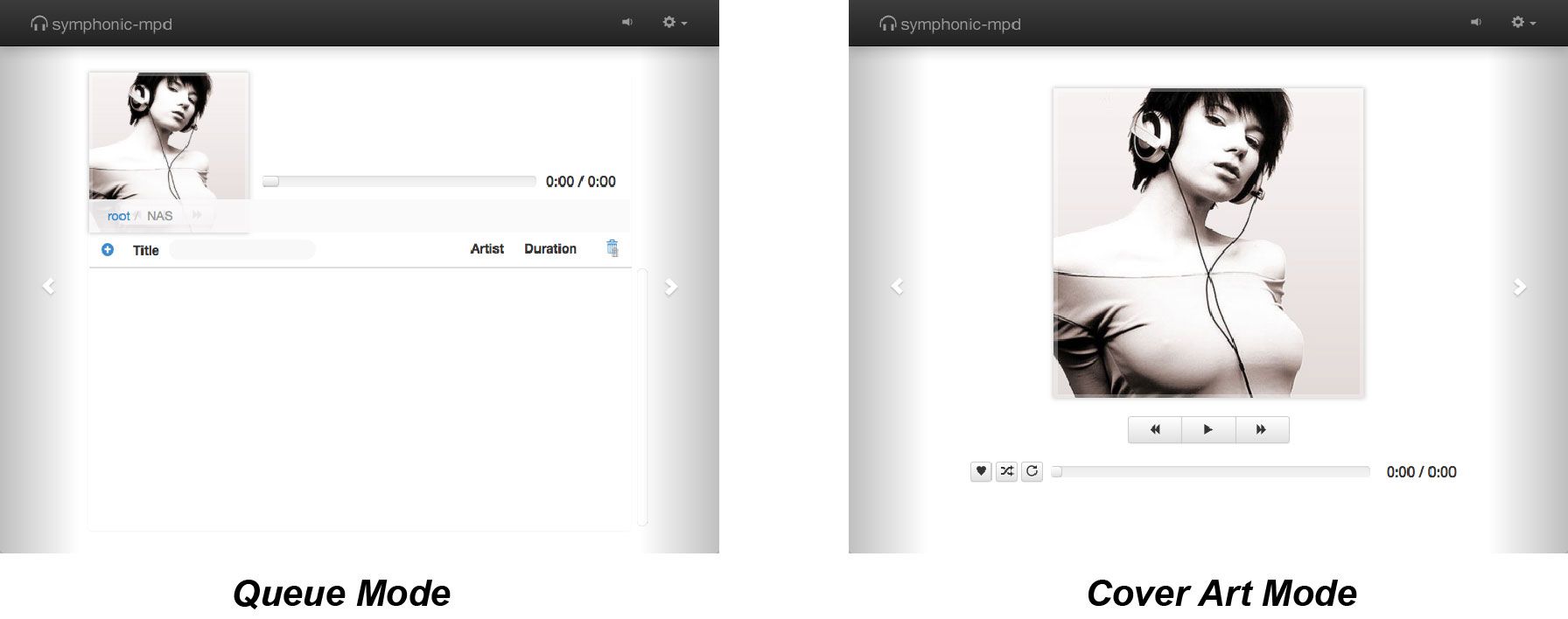 symphonic-mpd has two types of WebUI, “Queue Mode” and “Cover Art Mode”. You can switch modes by clicking the left and right edges of the WebUI.
